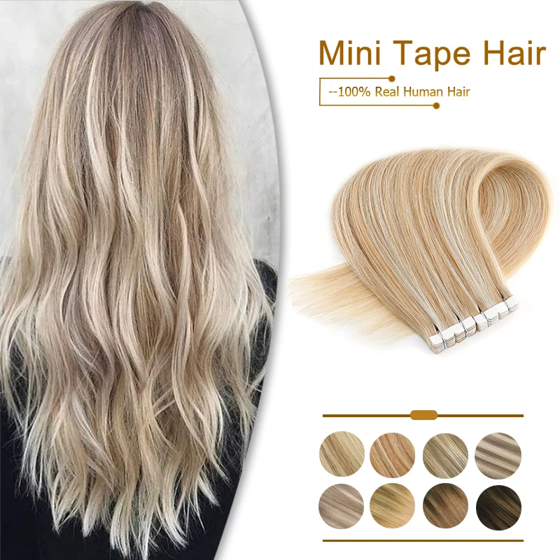 Reducido ZURIA-Mini cinta en extensiones de cabello humano, adhesivo Invisible de trama de piel, color mezclado, cabello Real Natural de 12, 16, 20 y 100% 8bWZwdJm79x
