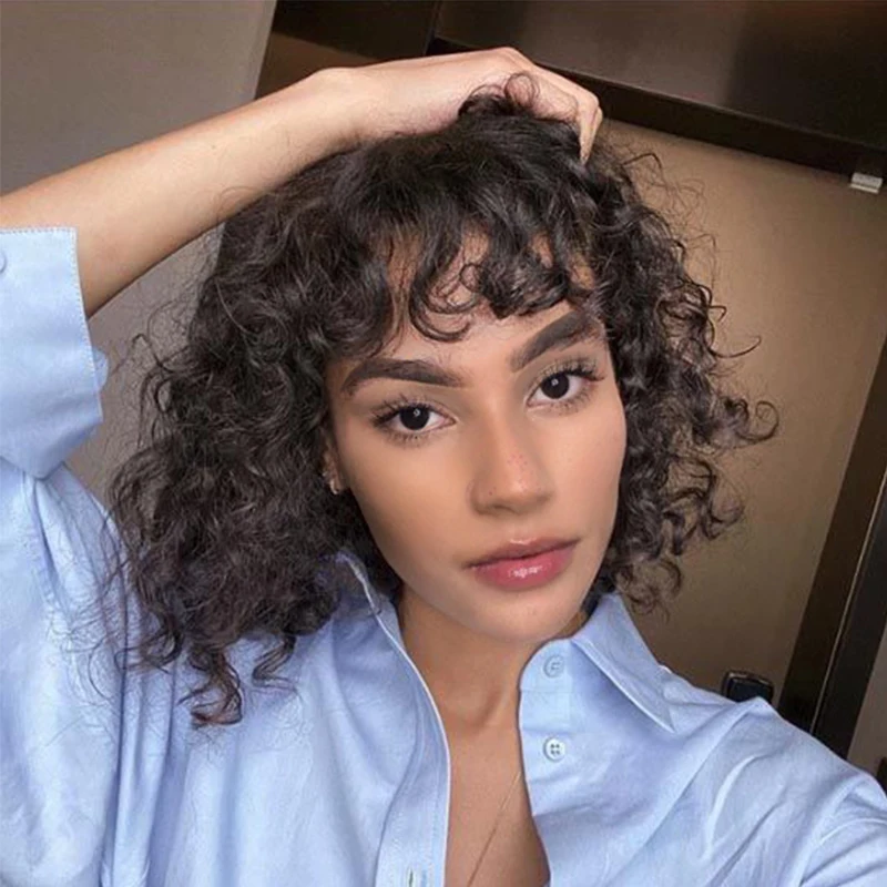 Name: Tupé de pelo humano brasileño con flequillo para mujer, base de seda hecha a máquina, pieza de sustitución media rizada con Clips para menos cabello