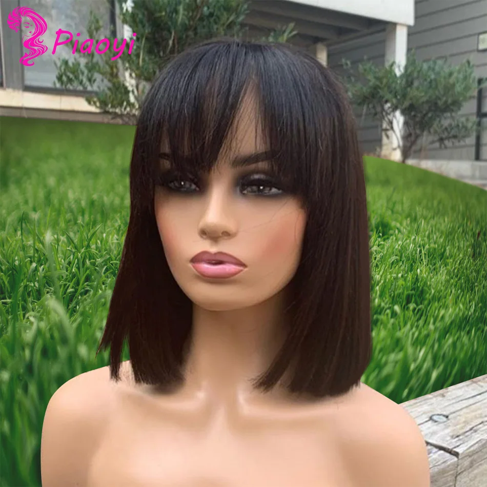 Mejor Pelucas de encaje de piaoyi Official Store por Bob corto pelucas de cabello humano brasileño liso, pelucas de corte corto Remy para mujeres negras, Color Natural, pelucas de máquina completa con explosión